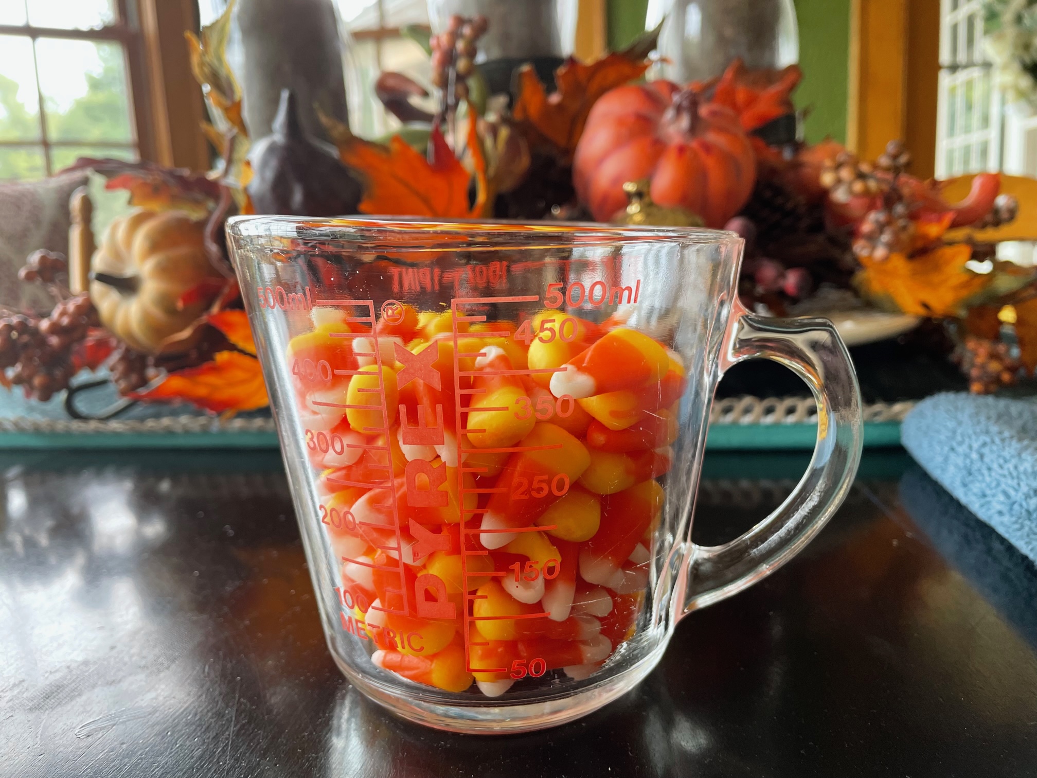 We love candy at vCalc. We took al 11 ounce bag of Bach's Candy Corn, measured it in a measuring cup and counted the kernels. We counted 161 candies at the 400 ml level of this measuring cup. Doing the math, that converts to 1524 kernels per gallon.