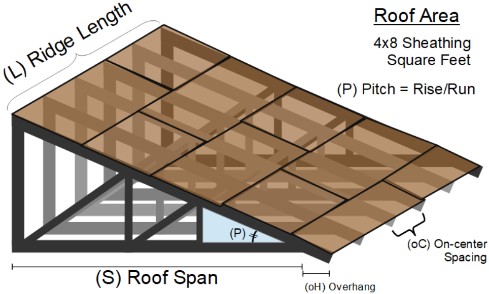 A simple solution is to compute the area (A) and divide by 32 ft2, the area of 4x8 sheet. However, this does not appropriately account for how 4x8s are used, specifically how cut-offs are reused. This algorithm provides an accurate an conservative number of 4x8 sheets for a shed roof, based on normal construction methods.