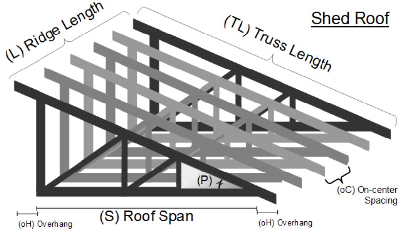 The truss length can be computed using the span (S), overhang (oH) and pitch (P) as follows: