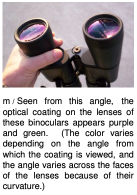 If you look at the front of a pair of high-quality binoculars, you will notice a greenish-blue coating on the lenses. This is advertised as a coating to prevent reflection. Now reflection is clearly undesirable --- we want the light to go in the binoculars --- but so far I've described reflection as an unalterable fact of nature, depending only on the properties of the two wave media. The coating can't change the speed of light in air or in glass, so how can it work? The key is that the coating itself is a wave medium. In other words, we have a three-layer sandwich of materials: air, coating, and glass. We will analyze the way the coating works, not because optical coatings are an important part of your education but because it provides a good example of the general phenomenon of wave interference effects.