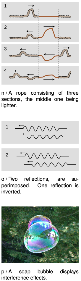 There are two different interfaces between media: an air-coating boundary and a coating-glass boundary. Partial reflection and partial transmission will occur at each boundary. For ease of visualization let's start by considering an equivalent system consisting of three dissimilar pieces of string tied together, and a wave pattern consisting initially of a single pulse. Figure n/1 shows the incident pulse moving through the heavy rope, in which its velocity is low. When it encounters the lighter-weight rope in the middle, a faster medium, it is partially