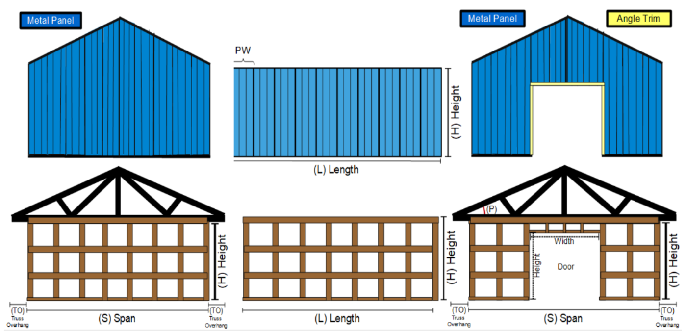 - Metal for Shed (Roof and Walls): This computes the total number and length of metal panels for the roof and walls based on the ridge length of the roof, the front and back heights, the width (span) of the building and the front and back overhangs.