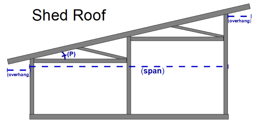 - Trusses for Shed Roof: This computes the total number and length of trusses for a single sloped roof based on the span, pitch, ridge length and the front and back overhangs.