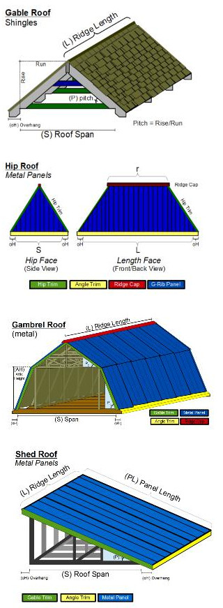 The most common shape of roofs are the basic gable roof (triangle ends), hip roofs (sloped on the ends), pyramid hip roofs (square up to a point), gambrel roofs (multiple slopes), and shed roof (single slopes).