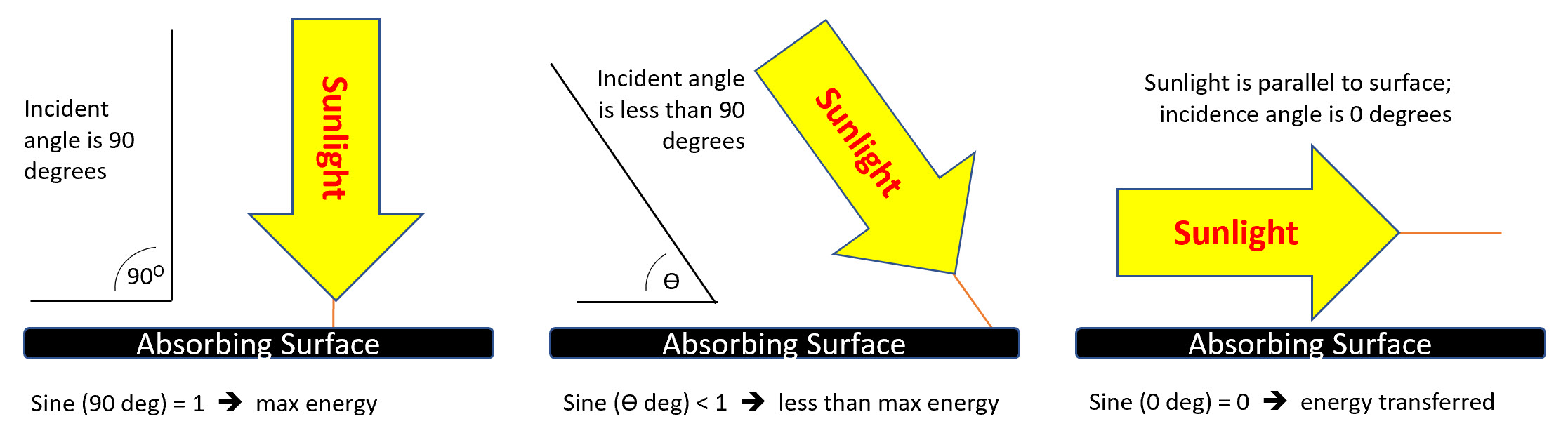 For intermediate angles, the relative power density varies with the sine of the incident angle. The angle, sin(θ), is the angle between the Sun's rays the normal (or perpendicular) and the absorbing surface. The Sine function you recall from high school trigonometry is 1 at 90 degrees and 0 at 0 degrees. So, incidence angle of sunlight's arrow pointing straight down on the surface gives us max energy and any angle less than 90 degrees incidence gives us less than max energy.