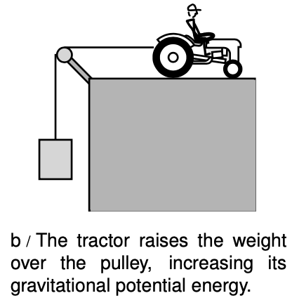 case where the tractor raises the weight at constant speed, so that there is no change in the kinetic energy of the weight, and we assume that there is negligible friction in the pulley, so that the force the tractor applies to the rope is the same as the rope's upward force on the weight. By Newton's first law, these forces are also of the same magnitude as the earth's gravitational force on the weight. The increase in the weight's potential energy is given by `FDeltay`, so the work done by the tractor on the weight equals `Fd`, the product of the force and the distance moved: