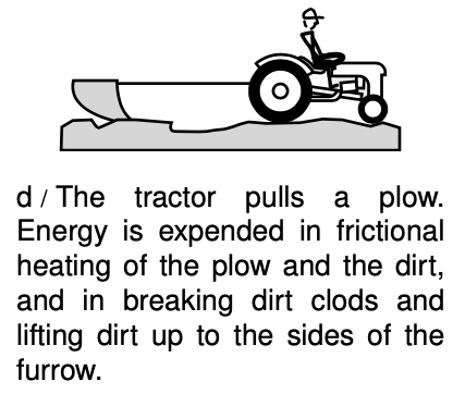 The law of conservation of energy guarantees that all the chemical energy in the gasoline will reappear in some form, but not necessarily in a form that is useful for doing farm work. Tractors, like cars, are extremely inefficient, and typically 90% of the energy they consume is converted directly into heat, which is carried away by the exhaust and the air flowing over the radiator. We wish to distinguish the energy that comes out directly as heat from the energy that serves to accelerate a trailer or to plow a field, so we define a technical meaning of the ordinary word “work” to express the distinction: