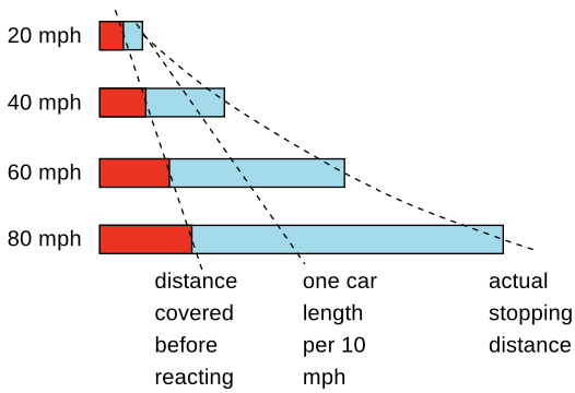 C To stop your car, you must first have time to react, and then it takes some time for the car to slow down. Both of these times contribute to the distance you will travel before you can stop. The figure shows how the average stopping distance increases with speed. Because the stopping distance increases more and more rapidly as you go faster, the rule of one car length per 10 m.p.h. of speed is not conservative enough at high speeds. In terms of work and kinetic energy, what is the reason for the more rapid increase at high speeds?