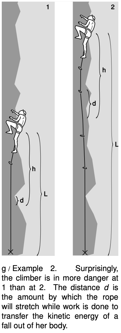 Example 2: The fall factorCounterintuitively, the rock climber may be in more danger in figure g/1 than later when she gets up to position g/2.