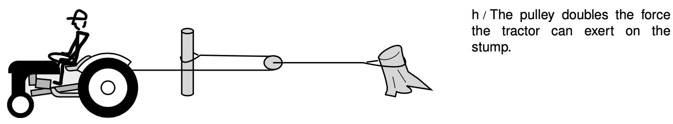 Figure h shows a pulley arrangement for doubling the force supplied by the tractor (book 1, section 5.6). The tension in the left-hand rope is equal throughout, assuming negligible friction, so there are two forces pulling the pulley to the left, each equal to the original force exerted by the tractor on the rope. This doubled force is transmitted through the right-hand rope to the stump.