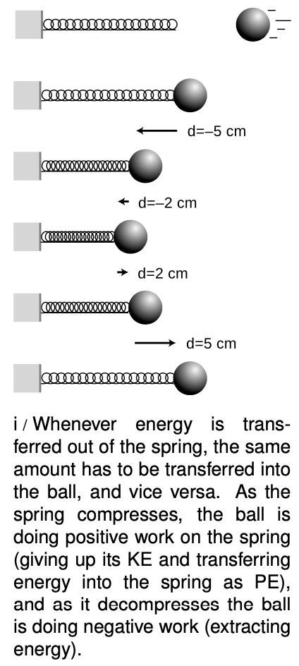 While the ball is moving to the left, we use `d<0` to represent its direction of motion, and the work done by the spring, `Fd`, comes out negative. This indicates that the spring is taking kinetic energy out of the ball, and accepting it in the form of its own potential energy.