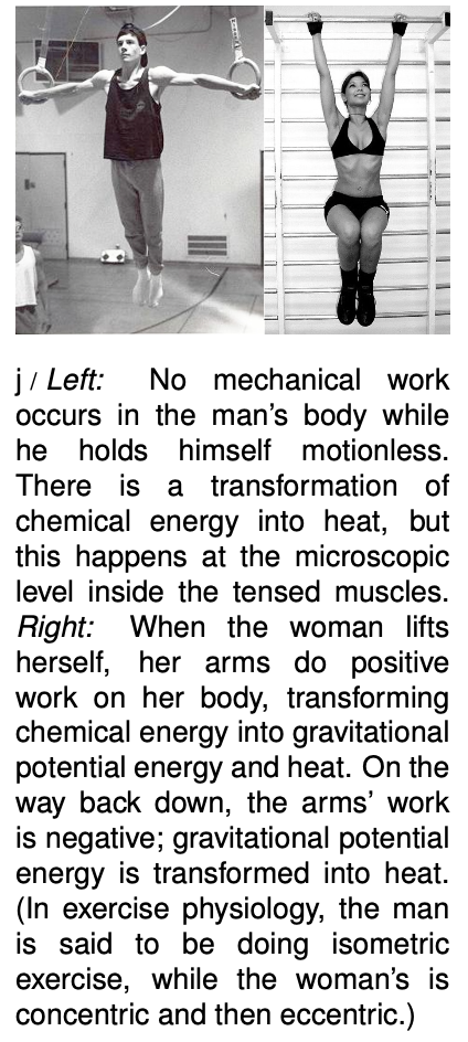 It may seem that when your arms do negative work by lowering a bag of cement, the cement is not really transferring energy into your body. If your body was storing potential energy like a compressed spring, you would be able to raise and lower a weight all day, recycling the same energy. The bag of cement does transfer energy into your body, but your body accepts it as heat, not as potential energy. The tension in the muscles that control the speed of the motion also results in the conversion of chemical energy to heat, for the same physiological reasons discussed previously in the case where you just hold the bag still.