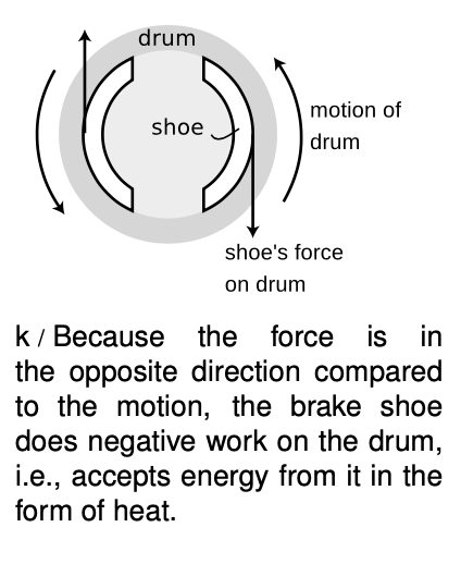 Does this equation always give the right answer? Well, sort of. In example d, there are two quantities of work you might want to calculate: the work done by the tractor on the plow and the work done by the plow on the dirt. These two quantities can't both equal `Fd`. Most of the energy transmitted through the cable goes into frictional heating of the plow and the dirt. The work done by the plow on the dirt is less than the work done by the tractor on the plow, by an amount equal to the heat absorbed by the plow. It turns out that the equation gives the work done by the tractor, not the work done by the plow. How are you supposed to know when the equation will work and when it won't? The somewhat complex answer is postponed until section 13.6. Until then, we will restrict ourselves to examples in which `W=Fd` gives the right answer; essentially the reason the ambiguities come up is that when one surface is slipping past another, `d` may be hard to define, because the two surfaces move different distances.