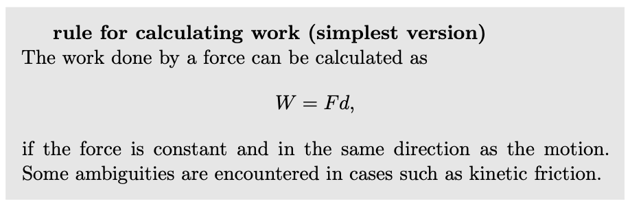 if the force is constant and along the same line as the motion. The quantity `d` is to be interpreted as a synonym for `Deltax`, i.e., positive and negative signs are used to indicate the direction of motion. Some ambiguities are encountered in cases such as kinetic friction.