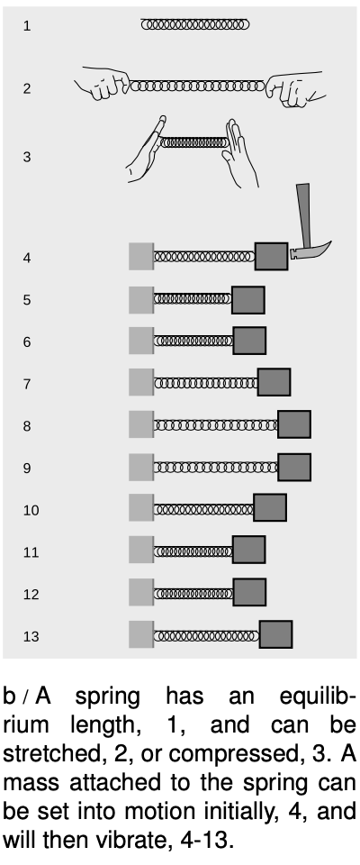 Figure b shows our most basic example of a vibration. With no forces on it, the spring assumes its equilibrium length, b1. It can be stretched, 2, or compressed, 3. We attach the spring to a wall on the left and to a mass on the right. If we now hit the mass with a hammer, 4, it oscillates as shown in the series of snapshots, 4-13. If we assume that the mass slides back and forth without friction and that the motion is one-dimensional, then conservation of energy proves that the motion must be repetitive. When the block comes back to its initial position again, 7, its potential energy is the same again, so it must have the same kinetic energy again. The motion is in the opposite direction, however. Finally, at 10, it returns to its initial position with the same kinetic energy and the same direction of motion. The motion has gone through one complete cycle, and will now repeat forever in the absence of friction.