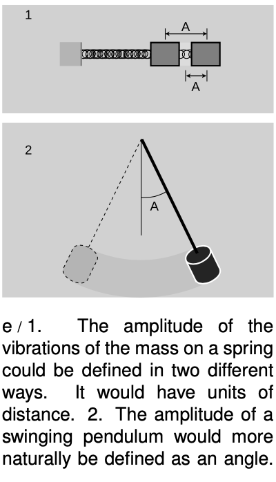 In other situations we would not even use the same units for amplitude. The amplitude of a child on a swing, or a pendulum, `e`/2, would most conveniently be measured as an angle, not a distance, since her feet will move a greater distance than her head. The electrical vibrations in a radio receiver would be measured in electrical units such as volts or amperes.