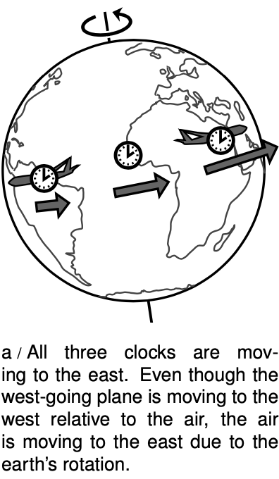 Most of these are not very subversive. Properties 1 and 2 date back to the time when Galileo and Newton started applying the same universal laws of motion to the solar system and to the earth; this contradicted Aristotle, who believed that, for example, a rock would naturally want to move in a certain special direction (down) in order to reach a certain special location (the earth's surface). Property 3 is the reason that Einstein called his theory “relativity,” but Galileo and Newton believed exactly the same thing to be true, as dramatized by Galileo's run-in with the Church over the question of whether the earth could really be in motion around the sun. Example 3 on p. 243 describes a modern, high-precision experiment that can be interpreted as a test of this principle. Property 4 would probably surprise most people only because it asserts in such a weak and specialized way something that they feel deeply must be true. The only really strange item on the list is 5, but the Hafele-Keating experiment forces it upon us.
