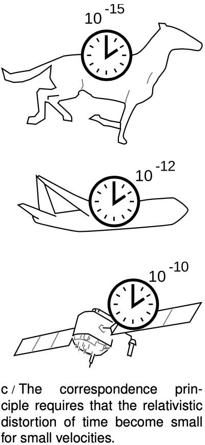 We can now see in more detail how to apply the correspondence principle. The behavior of the three clocks in the Hafele-Keating experiment shows that the amount of time distortion increases as the speed of the clock's motion increases. Newton lived in an era when the fastest mode of transportation was a galloping horse, and the best pendulum clocks would accumulate errors of perhaps a minute over the course of several days. A horse is much slower than a jet plane, so the distortion of time would have had a relative size of only ~ 10-15 --- much smaller than the clocks were capable of detecting. At the speed of a passenger jet, the effect is about 10-12, and state-of-the-art atomic clocks in 1971 were capable of measuring that. A GPS satellite travels much faster than a jet airplane, and the effect on the satellite turns out to be ~ 10-10. The general idea here is that all physical laws are approximations, and approximations aren't simply right or wrong in different situations. Approximations are better or worse in different situations, and the question is whether a particular approximation is good enough in a given situation to serve a particular purpose. The faster the motion, the worse the Newtonian approximation of absolute time. Whether the approximation is good enough depends on what you're trying to accomplish. The correspondence principle says that the approximation must have been good enough to explain all the experiments done in the centuries before Einstein came up with relativity.