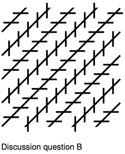 B: A question that students often struggle with is whether time and space can really be distorted, or whether it just seems that way. Compare with optical illusions or magic tricks. How could you verify, for instance, that the lines in the figure are actually parallel? Are relativistic effects the same, or not?