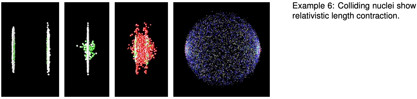E: Figure w from page 665, depicting the collision of two nuclei at the RHIC accelerator, is reproduced below. What would the shapes of the two nuclei look like to a microscopic observer riding on the left-hand nucleus? To an observer riding on the right-hand one? Can they agree on what is happening? If not, why not --- after all, shouldn't they see the same thing if they both compare the two nuclei side-by-side at the same instant in time?