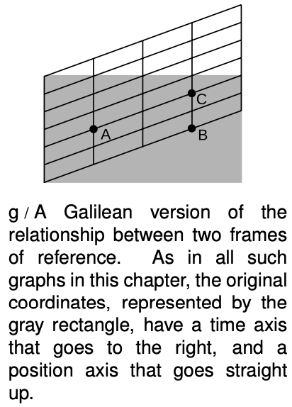 If it were not for property 5, we could imagine that figure g would give the correct transformation between frames of reference in motion relative to one another. Let's say that observer 1, whose grid coincides with the gray rectangle, is a hitch-hiker standing by the side of a road. Event A is a raindrop hitting his head, and event B is another raindrop hitting his head. He says that A and B occur at the same location in space. Observer 2 is a motorist who drives by without stopping; to him, the passenger compartment of his car is at rest, while the asphalt slides by underneath. He says that A and B occur at different points in space, because during the time between the first raindrop and the second, the hitch-hiker has moved backward. On the other hand, observer 2 says that events A and C occur in the same place, while the hitch-hiker disagrees. The slope of the grid-lines is simply the velocity of the relative motion of each observer relative to the other.