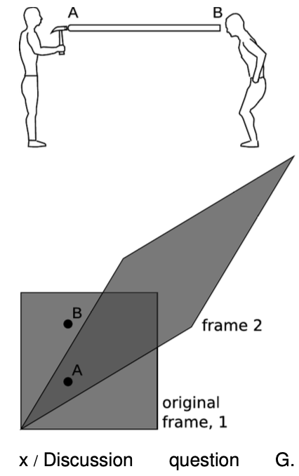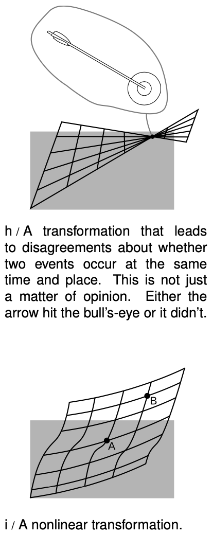 Figure h shows a transformation that might seem at first glance to be as good a candidate as any other, but it violates property 3, that motion is relative, for the following reason. In observer 2's frame of reference, some of the grid lines cross one another. This means that observers 1 and 2 disagree on whether or not certain events are the same. For instance, suppose that event A marks the arrival of an arrow at the bull's-eye of a target, and event B is the location and time when the bull's-eye is punctured. Events A and B occur at the same location and at the same time. If one observer says that A and B coincide, but another says that they don't, we have a direct contradiction. Since the two frames of reference in figure h give contradictory results, one of them is right and one is wrong. This violates property 3, because all inertial frames of reference are supposed to be equally valid. To avoid problems like this, we clearly need to make sure that none of the grid lines ever cross one another.