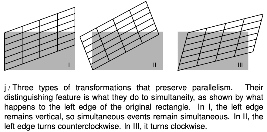 The examples in figures h and i show that the transformation we're looking for must be linear, meaning that it must transform lines into lines, and furthermore that it has to take parallel lines to parallel lines. Einstein wrote in his 1905 paper that “... on account of the property of homogeneity [property 1] which we ascribe to time and space, the [transformation] must be linear.”Applying this to our diagrams, the original gray rectangle, which is a special type of parallelogram containing right angles, must be transformed into another parallelogram. There are three types of transformations, figure j, that have this property. Case I is the Galilean transformation of figure g on page 655, which we've already ruled out.