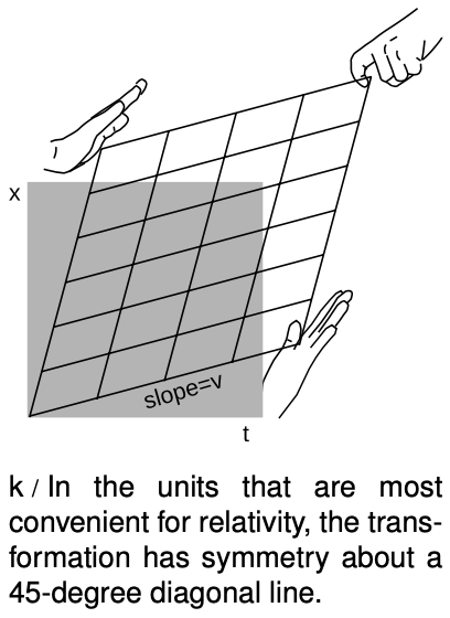 The only remaining possibility is case III, which I've redrawn in figure k with a couple of changes. This is the one that Einstein predicted in 1905. The transformation is known as the Lorentz transformation, after Hendrik Lorentz (1853-1928), who partially anticipated Einstein's work, without arriving at the correct interpretation. The distortion is a kind of smooshing and stretching, as suggested by the hands. Also, we've already seen in figures d-f on page 654 that we're free to stretch or compress everything as much as we like in the horizontal and vertical directions, because this simply corresponds to changing the units of measurement for time and distance. In figure k I've chosen units that give the whole drawing a convenient symmetry about a 45-degree diagonal line. Ordinarily it wouldn't make sense to talk about a 45-degree angle on a graph whose axes had different units. But in relativity, the symmetric appearance of the transformation tells us that space and time ought to be treated on the same footing, and measured in the same units.