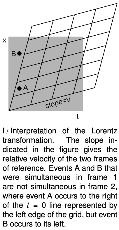 As in our discussion of the Galilean transformation, slopes are interpreted as velocities, and the slope of the near-horizontal lines in figure l is interpreted as the relative velocity of the two observers. The difference between the Galilean version and the relativistic one is that now there is smooshing happening from the other side as well. Lines that were vertical in the original grid, representing simultaneous events, now slant over to the right. This tells us that, as required by property 5, different observers do not agree on whether events that occur in different places are simultaneous. The Hafele-Keating experiment tells us that this non-simultaneity effect is fairly small, even when the velocity is as big as that of a passenger jet, and this is what we would have anticipated by the correspondence principle. The way that this is expressed in the graph is that if we pick the time unit to be the second, then the distance unit turns out to be hundreds of thousands of miles. In these units, the velocity of a passenger jet is an extremely small number, so the slope `v` in a figure like l is extremely small, and the amount of distortion is tiny --- it would be much too small to see on this scale.