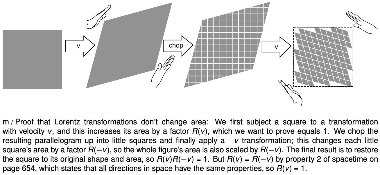 The only thing left to determine about the Lorentz transformation is the size of the transformed parallelogram relative to the size of the original one. Although the drawing of the hands in figure k may suggest that the grid deforms like a framework made of rigid coat-hanger wire, that is not the case. If you look carefully at the figure, you'll see that the edges of the smooshed parallelogram are actually a little longer than the edges of the original rectangle. In fact what stays the same is not lengths but areas, as proved in the caption to figure m.