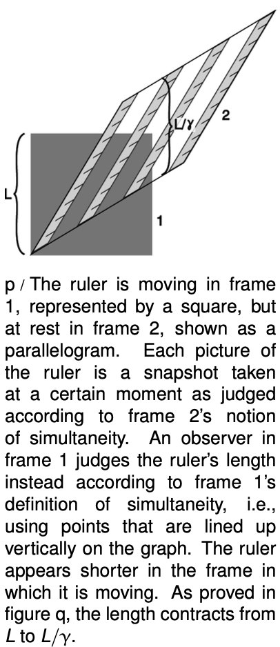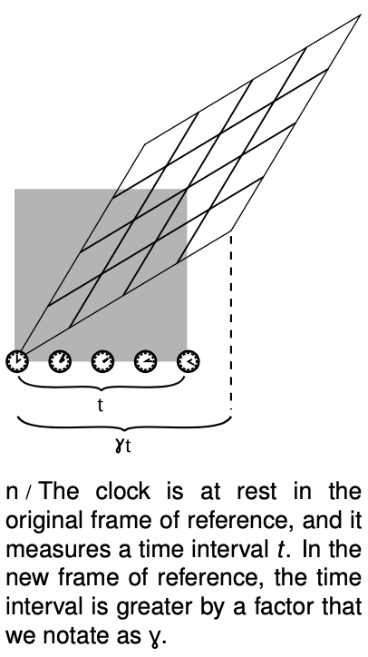 Figure l showed us that observers in different frames disagree on whether different events are simultaneous. This is an indication that time is not absolute, so we shouldn't be surprised that time's rate of flow is also different for different observers. We use the symbol `gamma` (Greek letter gamma) defined in the figure n to measure this unequal rate of flow. With a little algebra and geometry (homework problem 2, page 673), one can use the equal-area property to show that this ratio is given by