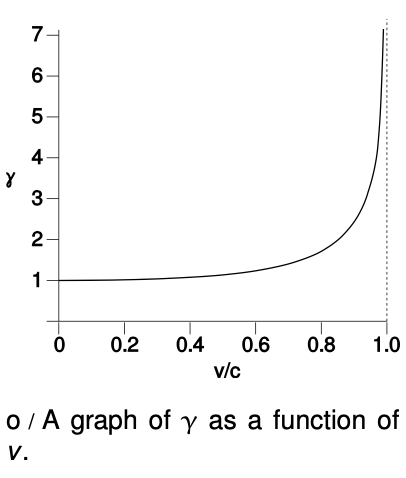 Figure o shows that the approximation found in example 2 is not valid for large values of `v"/"c`. In fact, `gamma` blows up to infinity as `v` gets closer and closer to `c`.