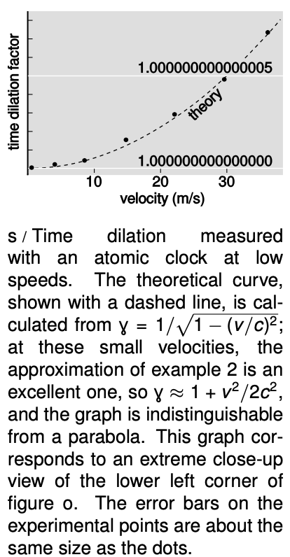 Example 2 shows that when `v` is small, relativistic effects are approximately proportional to `v^2`, so it is very difficult to observe them at low speeds. For example, a car on the freeway travels at about 1/10 the speed of a passenger jet, so the resulting time dilation is only 1/100 as much. For this reason, it was not until four decades after Hafele and Keating that anyone did a conceptually simple atomic clock experiment in which the only effect was motion, not gravity; it is difficult to move a clock at a high enough velocity without putting it in some kind of aircraft, which then has to fly at some altitude. In 2010, however, Chou et al. succeeded in building an atomic clock accurate enough to detect time dilation at speeds as low as 10 m/s. Figure s shows their results. Since it was not practical to move the entire clock, the experimenters only moved the aluminum atoms inside the clock that actually made it “tick.”