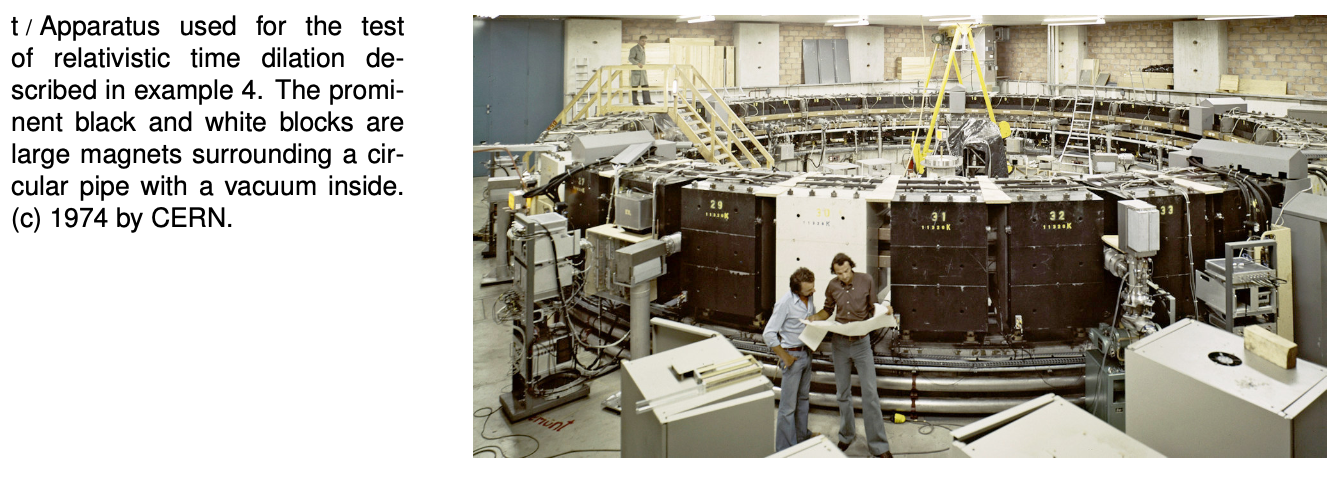 By the way, don't get an inflated idea of the importance of these atomic clock experiments. Special relativity had already been confirmed by a vast and varied body of experiments decades before the 1970's. The only reason I'm giving such a prominent role to these experiments, which were actually more important as tests of general relativity, is that they were conceptually very direct. It would be nice to have an equally simple and transparent atomic clock experiment in which only the effect of motion was singled out, with no gravitational effect. Example 3 on page 662 describes how something along these lines was eventually carried out, forty years after the Hafele-Keating experiment.