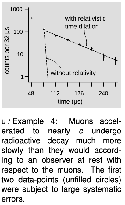 Particles called muons (named after the Greek letter `mu`, “myoo”) were produced by an accelerator at CERN, near Geneva. A muon is essentially a heavier version of the electron. Muons undergo radioactive decay, lasting an average of only 2.197 `mu`s before they evaporate into an electron and two neutrinos. The 1974 experiment was actually built in order to measure the magnetic properties of muons, but it produced a high-precision test of time dilation as a byproduct. Because muons have the same electric charge as electrons, they can be trapped using magnetic fields. Muons were injected into the ring shown in figure t, circling around it until they underwent radioactive decay. At the speed at which these muons were traveling, they had `gamma=29.33`, so on the average they lasted 29.33 times longer than the normal lifetime. In other words, they were like tiny alarm clocks that self-destructed at a randomly selected time. Figure u shows the number of radioactive decays counted, as a function of the time elapsed after a given stream of muons was injected into the storage ring. The two dashed lines show the rates of decay predicted with and without relativity. The relativistic line is the one that agrees with experiment.