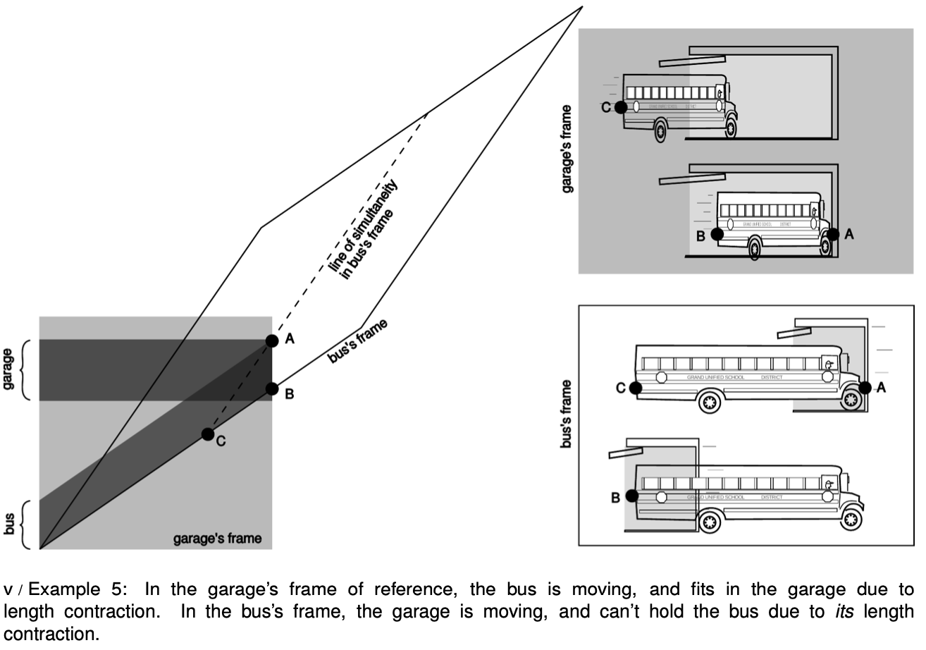 The paradox is resolved when we recognize that the concept of fitting the bus in the garage “all at once” contains a hidden assumption, the assumption that it makes sense to ask whether the front and back of the bus can simultaneously be in the garage. Observers in different frames of reference moving at high relative speeds do not necessarily agree on whether things happen simultaneously. As shown in figure v, the person in the garage's frame can shut the door at an instant B he perceives to be simultaneous with the front bumper's arrival A at the back wall of the garage, but the driver would not agree about the simultaneity of these two events, and would perceive the door as having shut long after she plowed through the back wall.
