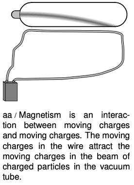 Figure aa shows an example that is conceptually simple, but not very practical. If you try this with a typical vacuum tube, like a TV or computer monitor, the current in the wire probably won't be enough to produce a visible effect. A more practical method is to hold a magnet near the screen. We still have an interaction between moving charges and moving charges, but the swirling electrons in the atoms in the magnet are now playing the role played by the moving charges in the wire in figure aa. Warning: if you do this, make sure your monitor has a demagnetizing button! If not, then your monitor may be permanently ruined.