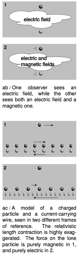 Figure ac/2 shows what we'd see if we were observing all this from a frame of reference moving along with the lone charge. Here's where the relativity comes in. Relativity tells us that moving objects appear contracted to an observer who is not moving along with them. Both lines of charge are in motion in both frames of reference, but in frame 1 they were moving at equal speeds, so their contractions were equal. In frame 2, however, their speeds are unequal. The dark charges are moving more slowly than in frame 1, so in frame 2 they are less contracted. The light-colored charges are moving more quickly, so their contraction is greater now. The “cars” on the two sides of the “road” are no longer paired off, so the electrical forces on the lone particle no longer cancel out as they did in ac/1. The lone particle is attracted to the wire, because the particles attracting it are more dense than the ones repelling it. Furthermore, the attraction felt by the lone charge must be purely electrical, since the lone charge is at rest in this frame of reference, and magnetic effects occur only between moving charges and other moving charges.