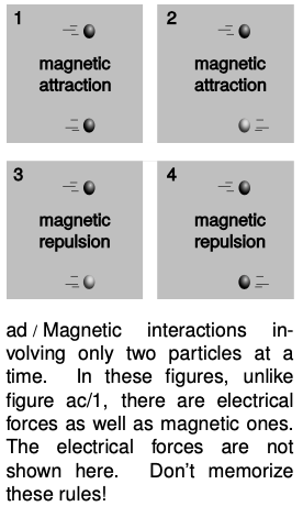 The basic rules for magnetic attractions and repulsions, shown in figure ad, aren't quite as simple as the ones for gravity and electricity. Rules ad/1 and ad/2 follow directly from our previous analysis of figure ac. Rules 3 and 4 are obtained by flipping the type of charge that the bottom particle has. For instance, rule 3 is like rule 1, except that the bottom charge is now the opposite type. This turns the attraction into a repulsion. (We know that flipping the charge reverses the interaction, because that's the way it works for electric forces, and magnetic forces are just electric forces viewed in a different frame of reference.)