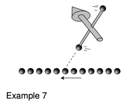 To see how this really works out, we need to find a nice simple example. An example like figure ab is not easy to handle, because in the second frame of reference, the moving charges create fields that change over time at any given location, like when the V-shaped wake of a speedboat washes over a buoy. Examples like figure aa are easier, because there is a steady flow of charges, and all the fields stay the same over time. Figure ac/1 shows a simplified and idealized model of figure aa. The charge by itself is like one of the charged particles in the vacuum tube beam of figure aa, and instead of the wire, we have two long lines of charges moving in opposite directions. Note that, as discussed in discussion question C on page 575, the currents of the two lines of charges do not cancel out. The dark and light balls represent particles with opposite charges. Because of this, the total current in the “wire” is double what it would be if we took away one line.