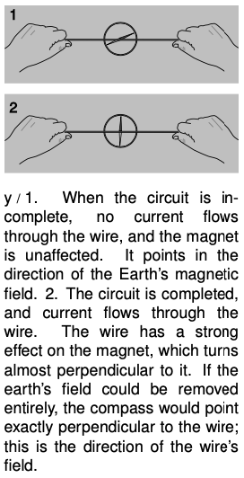 That was where things stood until 1820, when the Danish physicist Hans Christian Oersted was delivering a lecture at the University of Copenhagen, and he wanted to give his students a demonstration that would illustrate the cutting edge of research. He generated a current in a wire by making a short circuit across a battery, and held the wire near a magnetic compass. The ideas was to give an example of how one could search for a previously undiscovered link between electricity (the electric current in the wire) and magnetism. One never knows how much to believe from these dramatic legends, but the story is that the experiment he'd expected to turn out negative instead turned out positive: when he held the wire near the compass, the current in the wire caused the compass to twist!