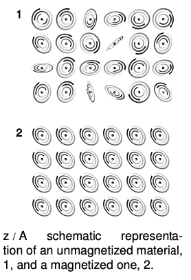 Oersted was eventually led to the conclusion that magnetism was an interaction between moving charges and other moving charges, i.e., between one current and another. A permanent magnet, he inferred, contained currents on a microscopic scale that simply weren't practical to measure with an ammeter. Today this seems natural to us, since we're accustomed to picturing an atom as a tiny solar system, with the electrons whizzing around the nucleus in circles. As shown in figure z, a magnetized piece of iron is different from an unmagnetized piece because the atoms in the unmagnetized piece are jumbled in random orientations, whereas the atoms in the magnetized piece are at least partially organized to face in a certain direction.