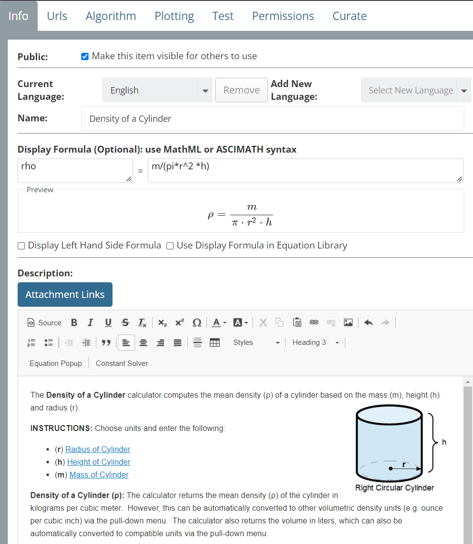 Public: You will notice that there is a button on the Info tab under Options to “Make this item visible for others to use". If you choose this option, your equation will be available to any vCalc user. We encourage people to share their knowledge and efforts by checking this box. If you leave this box unchecked, the equation will only be visible to you and then only when you are logged into vCalc. It will be your private equation. Note: To be available to the public, all equations must have all successful tests (see Using the Test Tab), and there must be at least one test case. Making an equation public is your option and your equation is yours alone unless you choose to share it.