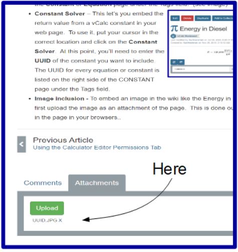 - Data Item Solver – This let’s you embed the return value from a vCalc data item in your web page. To use it, put your cursor in the correct location and click on the Data Item Solver. At this point, you’ll need to enter the UUID of the constant you want to include. The UUID for every equation or data item is listed on the right side of the Data Item page under the Tags field.