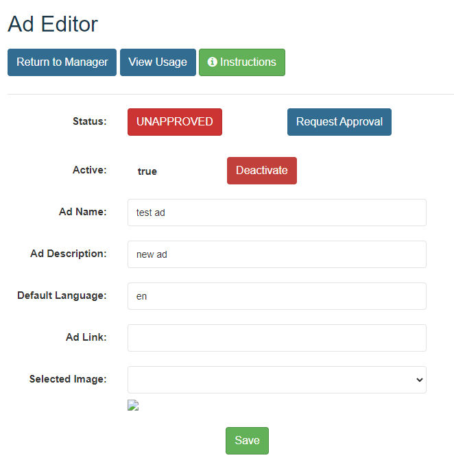 The main ad editor contains additional details such as the status of your ad (Approved, Unapproved, or Pending), whether or not it is active (you can turn your ads off by making them inactive), name, description, language, destination link, and display image.