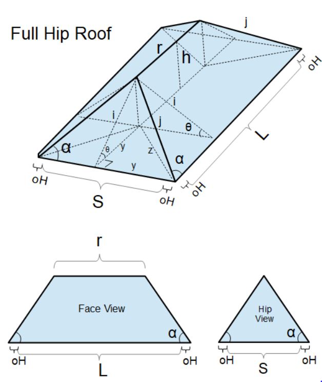 - Two Pitch Hip Roof Geometries: Computes the metrics associated with a hip roof with two angles (side and face) based on the overall roof length, roof span, pitch of the main face and pitch of the hips.