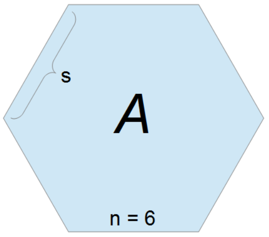 A regular n-sided polygon is a polygon with n equal length sides and is a polygon which has n equal angles at the n vertices of the polygon. This formula uses the polygon area equation: