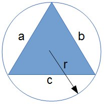 `A = pi * ((a * b * c) / (4sqrt((a+b+c)/2((a+b+c)/2-a)((a+b+c)/2-b)((a+b+c)/2-c))))^2`