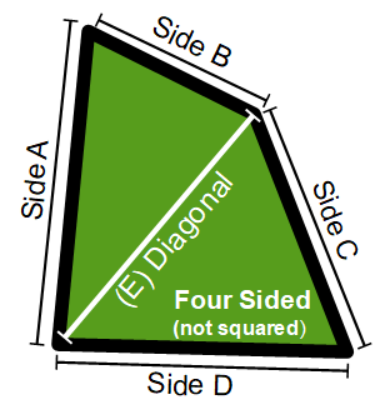 The Four Sided Land Size (not square) calculator computes the acres, square feet and perimeter of land with four straight sides given the length of the four sides and the length of a diagonal between opposing corners.