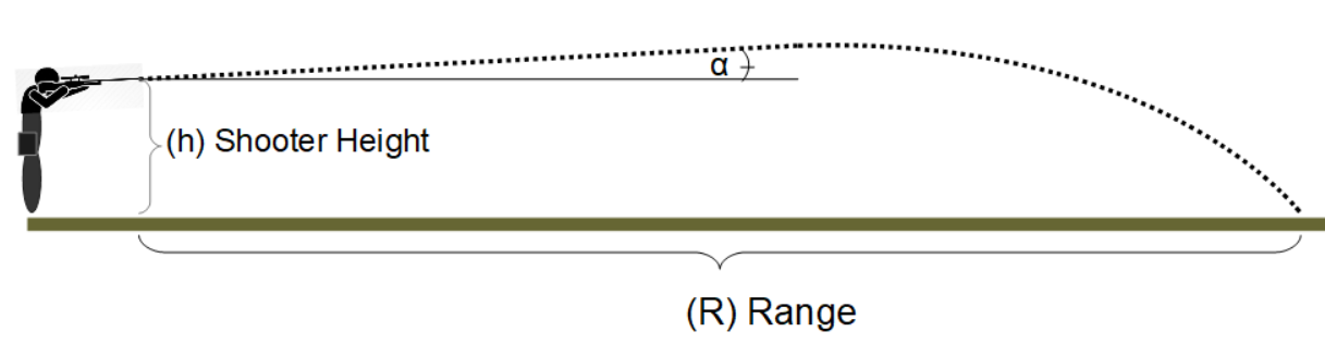 The Bullet Flight Range calculator computes the maximum range (horizontal distance) traveled by a bullet based on the muzzle velocity (V), elevation angle (α), shooter height (h), and the acceleration due to gravity. Note: This does not account for air resistance or wind factors.